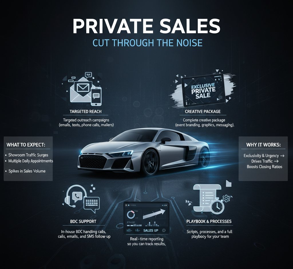 Private sales cut through the noise of everyday marketing. Customers feel urgency when an event is exclusive and time-bound, which drives traffic and increases closing ratios.